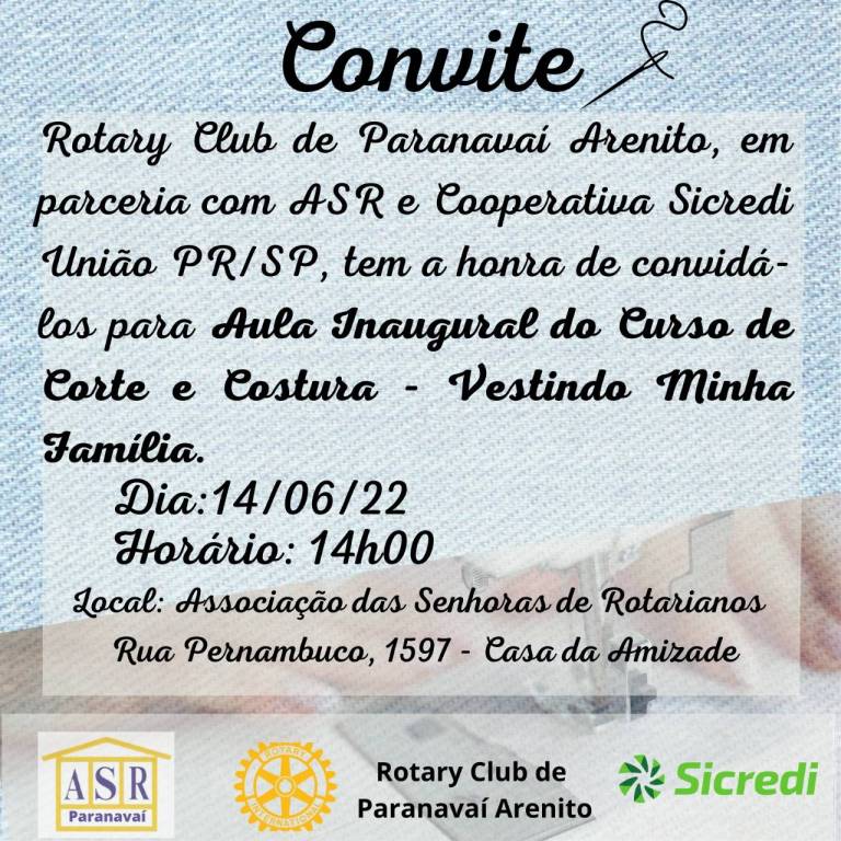 Aula Inaugural do Curso de Corte e Costura, Projeto Vestindo Minha Família, em parceria com Cooperativa Sicrdi Uniã PR/SP e ASR - Associação de Senhoras de Rotarianos de Paranavaí.